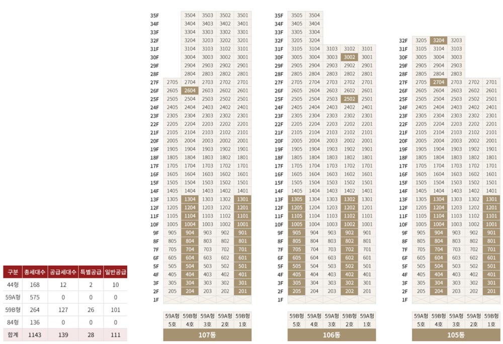 총 7동 지하3층~지상 35층 1,143세대 (전용 44㎡ / 59A㎡ / 59B㎡ / 84㎡) 중 공공지원 민간임대주택 139세대 (전용 44㎡ / 59A㎡) 특별공급 28호, 일반공급 111호