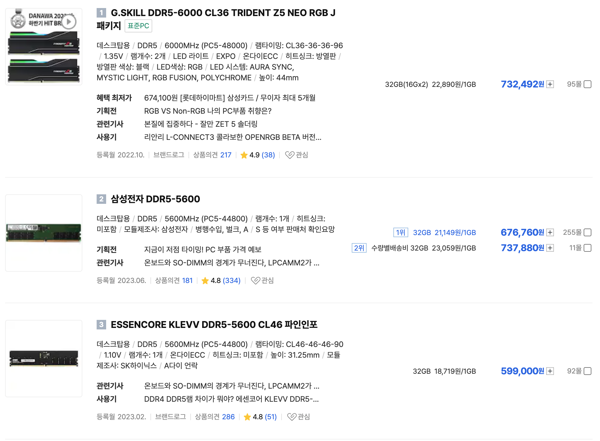 | DDR5 32GB (2x16GB) 5600MHz | 약 17만원 | 46만~70만원 | 약 300% |